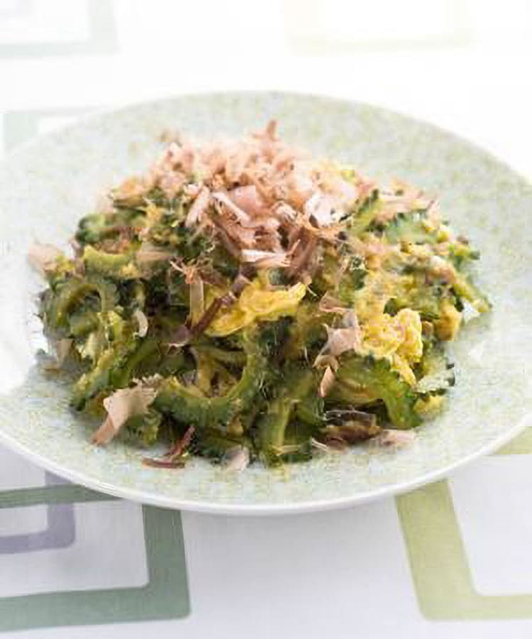 フライパンにサラダ油大さじ1を強火で熱し、ゴーヤーを炒める。しんなりしたら塩小さじ1/2としょうゆ、砂糖各小さじ1を入れて炒め、溶き卵を回し入れて大きく混ぜる。半熟状になったら器に盛り、削り節をのせる。