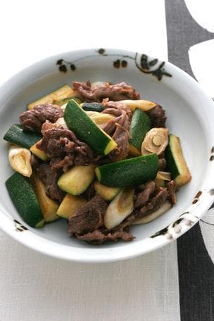 フライパンにごま油大さじ1/2を弱火で熱し、しょうがを炒める。香りが立ったらズッキーニを入れ、中火にして1分ほど炒める。ねぎを加えて1分炒め、牛肉を加えて1~2分炒める。
