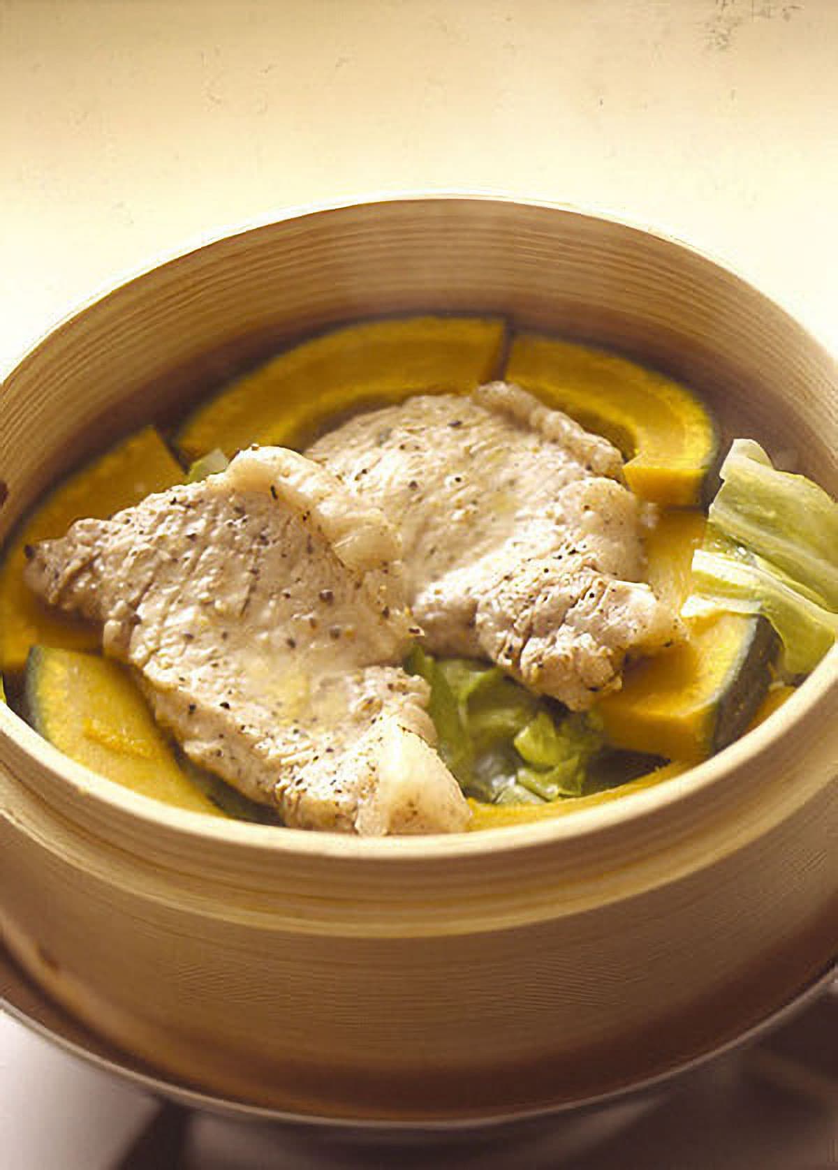鍋に水を八分目くらいまで入れて強火にかけ、湯を沸かす。せいろにキャベツを敷きつめ、かぼちゃを縁に並べて、豚肉を重ならないようにのせる。蒸気が上がったら、ふたをして鍋にせいろをのせ、10~12分蒸す。かぼちゃに竹串を刺してみて、すーっと通るくらいになったらせいろを火からおろす。