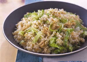 ご飯を加えて強めの中火にし、木べらで切るようにしてほぐしながら炒め合わせる。ご飯がぱらりとしたら、塩、粗びき黒こしょう各少々で味をととのえ、火を止める。レタスを加えてさっと混ぜ、器に盛る。