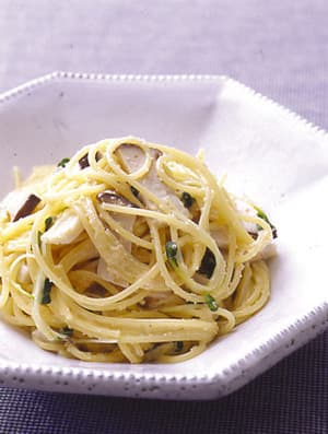 スパゲティがゆで上がる1分ほど前に、【1】の鍋にエリンギを加える。スパゲティがゆで上がったら、ともにざるに上げて湯をきり、すぐに【2】のボールに貝割れ菜とともに加えてあえる。