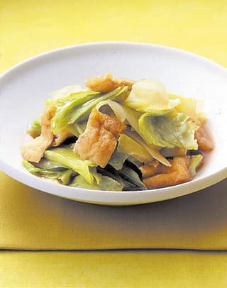 キャベツは堅いしんを取り、大きめの一口大にちぎる。しんは縦に薄切りにする。油揚げはざるに入れ、熱湯を回しかける。粗熱を取って水けを絞り、3cm四方に切る。