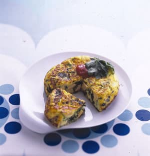 小さめ(直径16cmくらい)のフライパンにバター10gを強めの中火で熱し、バターが溶けたら、すぐにツナを入れて1~2分炒める。玉ねぎ、ほうれん草を加えて3分ほど炒め、玉ねぎがしんなりしたらチーズを加え、さっと混ぜ合わせる。弱火にして1の卵液を流し入れ、卵が固まっていない部分を菜箸でときどき混ぜながら、10分ほど焼く。ふたをして、さらに2~3分焼く。