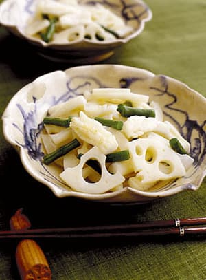 ロールいかは室温に15分ほど置いて解凍する。れんこんはピーラーで皮をむき、縦4等分に切ってから、横に幅5mmに切る。切ったものから薄い酢水(水3カップに対して酢小さじ1が目安)に5分ほどさらし、ペーパータオルでしっかりと水けを拭く。いんげんはへたと、あれば筋を取る。いかの片面に、包丁で細かく格子状の切り目を入れ、横半分に切ってから、縦に幅1cmに切る。計量カップに合わせ調味料の材料を混ぜ合わせる。