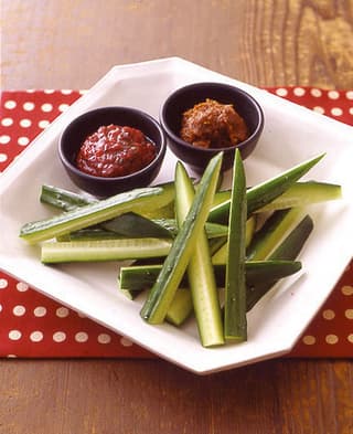 器にきゅうりを盛って、梅だれ、みそだれを添え、好みのたれをつけながらいただく。