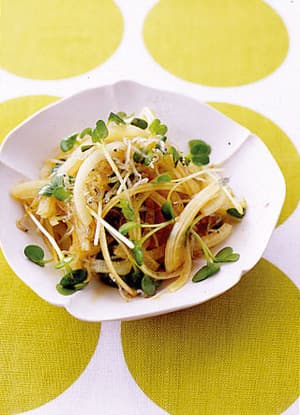 - 1玉ねぎ1/2個は横に薄切りにし、根元を切った貝割れ菜30gとともにボールに入れる。ちりめんじゃこ大さじ4、市販のポン酢しょうゆ大さじ2を加えて混ぜる。