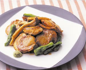 フライパンにサラダ油少々を中火で熱し、帆立て、エリンギを入れて、全体に焼き色がつくまで3分ほど炒める。しし唐を加えてさっと炒め、しょうゆ、みりん各大さじ1、砂糖小さじ2を入れて全体にからめる。火を止めて器に盛り、練りわさび適宜を添える。