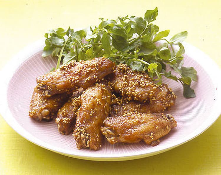 揚げ油を中温(170~180℃。乾いた菜箸の先を鍋底に当てると、細かい泡がシュワシュワッとまっすぐ出る程度)に熱して手羽中を入れ、ときどき上下を返しながら5~6分揚げる。油をきって熱いうちにたれのボールに加え、全体にからめる。器に盛り、クレソンを添える。