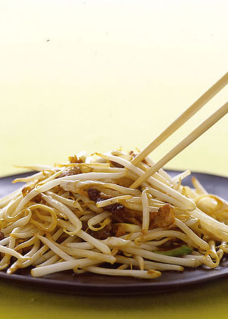 もやし、ねぎを加え、もやしの表面に油がなじむまで菜箸で全体を返すように混ぜ、器に盛る。