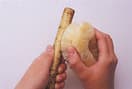 まず、表面の土をさっと洗い落とします。次に、流水に当てながらたわしでかるくこすり、皮をこそげ取ります。あまりきれいにこそげすぎると風味がなくなってしまうので、土が落ち、表面が薄い茶色になるくらいでOK。