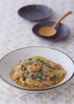 フライパンにサラダ油大さじ1/2をたして中火で熱し、豚ひき肉をぽろぽろに炒める。色が完全に変わったらにんにく、しょうが、ねぎを加えて炒め、香りが立ったら青梗菜を加えて炒め合わせる。Aを加え、かきを戻し入れて2分ほど煮、煮立ったら片栗粉小さじ1を水小さじ2で溶いて加えてとろみをつける。少し煮つめ、ごま油少々をふって火を止める。