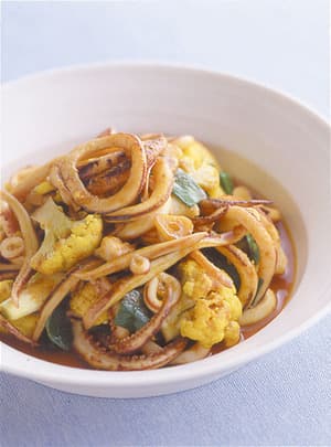 フライパンににんにくと、サラダ油大さじ1を入れて弱火で炒め、香りが立ったらにんにくを取り出す。続けていかを入れ、中火にして1分ほど炒める。カリフラワーを加えて3~4分炒め、カレー粉と、塩小さじ1/2をふり、水1/4カップを注ぐ。強火にして汁けがほとんどなくなったら、わけぎ、にんにくを入れて混ぜ、火を止める。