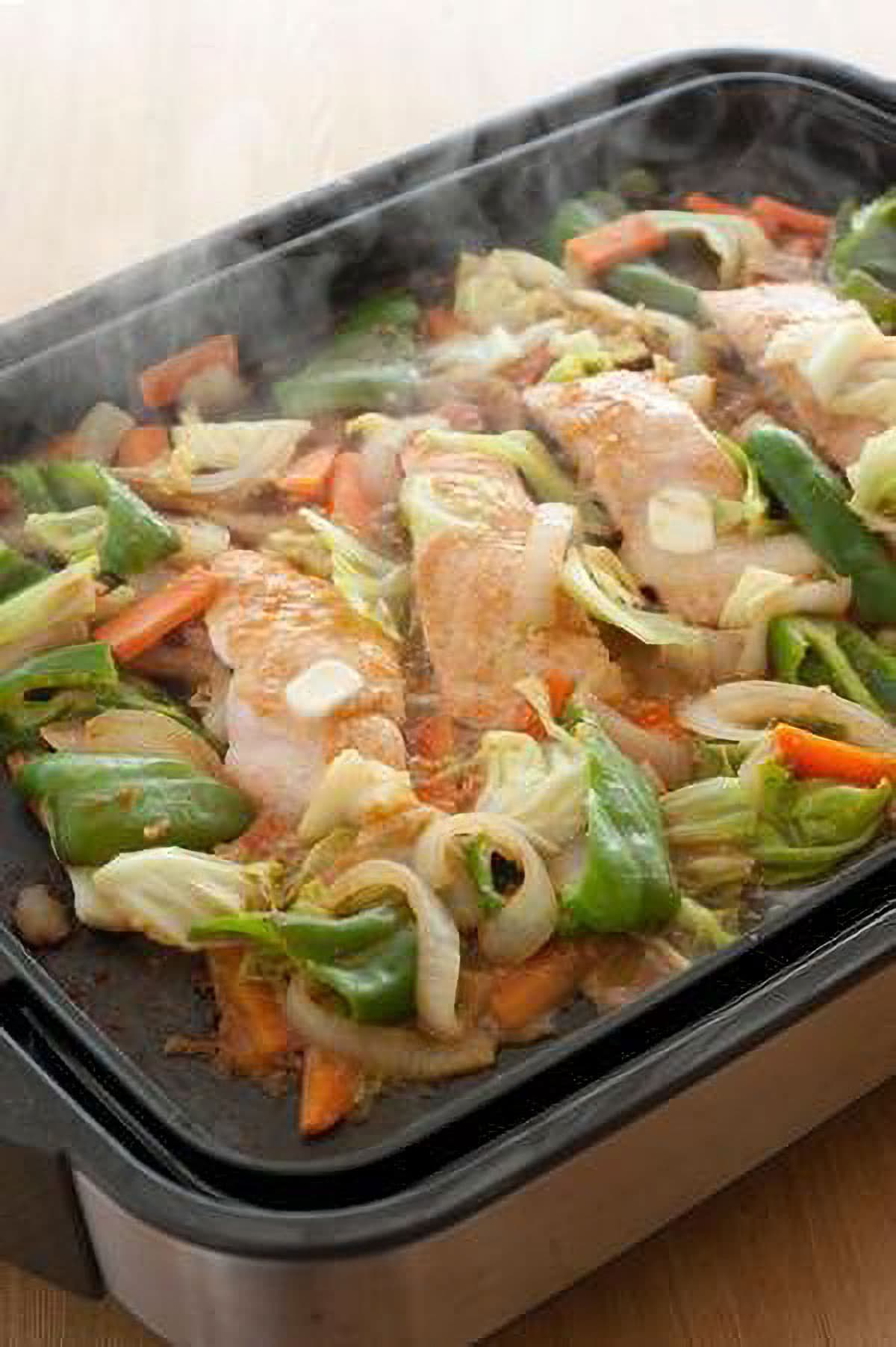 鮭の身に焼き色がついたら返し、まわりに野菜を広げるようにして入れ、ふたをする。温度を160℃にセットし、5~6分蒸し焼きにする。