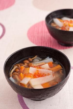 鍋にだし汁、なめこ以外の【1】と、塩少々を入れて中火にかける。ひと煮立ちしたら弱火にし、15分ほど煮る。なめこを加えてアクを除き、薄口しょうゆ、酒大さじ1を加えて調味する。全体にとろみがついたら器に盛り、イクラをのせる。
