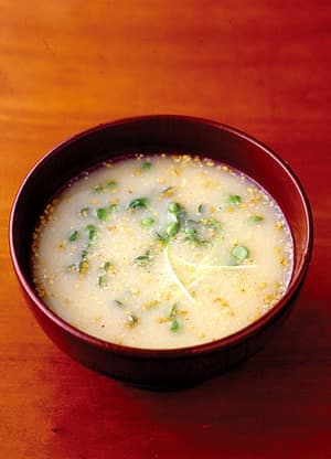 貝割れ菜1/2パック(約30g)は根元を切る。器1個に白すりごま大さじ1/2、みそ大さじ1、砂糖少々と、貝割れ菜の1/2量を入れ、熱湯1カップを注ぐ。もう1人分も同様に作り、みそを溶くように、よく混ぜていただく。