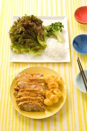 ねぎは長さ6cmに切り、縦に1本切り目を入れてしんを取り、縦にせん切りにする。水にさらしてシャキッとさせ、水けを拭く(しらがねぎ)。貝割れ菜は根元を切る。鶏肉とじゃがいも、サニーレタス、貝割れ菜、ねぎを器に盛って、包みながらいただく。
