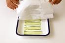 きゅうりはへたを切り落とし、ピーラーで縦に6枚の薄切りにし、水けを拭く。クリームチーズは1cm角、長さ2cmの棒状に6切れ切る。