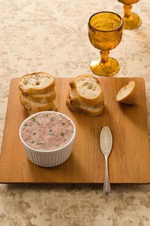 別のボールにコンビーフを入れ、フォークでほぐす。【1】のボールにコンビーフ、ミントを加え、ゴムべらで混ぜ合わせる。ココット(なければ好みの器)にきっちりと入れ、ラップをかけて表面をかるく押さえて平らにする。バゲットを食べやすく切って添える。