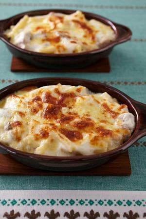 耐熱皿に【7】を等分に入れて、残りのホワイトソースをかけ、ピザ用チーズを全体に散らす。オーブントースターに入れ、チーズが溶けて焼き色がつくまで、10分ほど焼く。