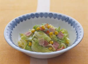 フライパンにオリーブ油を弱火で熱し、ベーコンを炒める。ベーコンの色が変わったら、キャベツ、ホールコーン、スープの素と、塩小さじ1/3、こしょう少々、水1/4カップを加えて混ぜる。ふたをして中火にし、5~6分蒸し煮にする。