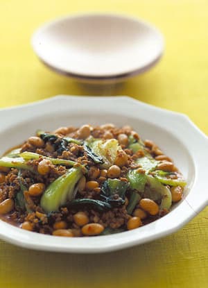 中華鍋(またはフライパン)にサラダ油大さじ1/2を中火で熱し、ひき肉を炒める。肉の色が変わったら、にんにく、ねぎ、大豆を加えて炒め合わせ、豆板醤を加えてさらに炒める。