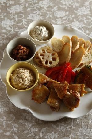 フライパンにオリーブオイルを薄く塗って弱火で熱し、れんこんと、鶏肉を皮目を下にして並べ入れる。れんこんは両面をこんがりと焼き、焼けたものから取り出す。鶏肉はこんがりと焼き色がつき、肉の厚みの半分以上に火が通ったら裏返し、全体の色が変わったら取り出す。中火にし、パプリカ、かぼちゃを順に並べ入れて、両面をこんがりと焼き、焼けたものから取り出す。バゲットとともに器に盛り、3種のディップを添える。