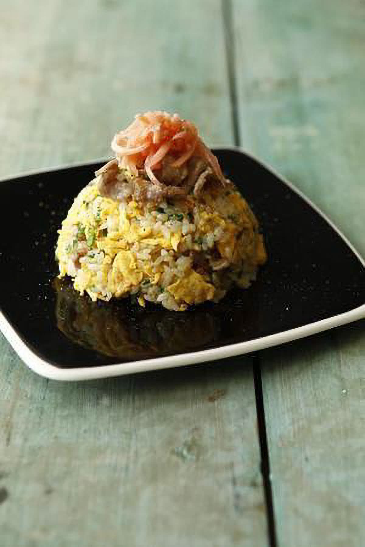 フライパンをさっと拭き、サラダ油大さじ1を中火で熱して、卵液を一気に流し入れる。菜箸で大きく混ぜ、卵の縁が固まってきたらご飯を加え、ご飯に卵をからめるようにほぐしながら炒める。豚肉を戻し入れ、塩小さじ1/3を入れて全体を混ぜ合わせる。万能ねぎを加え、しょうゆ適宜を鍋肌から回し入れて混ぜ、火を止める。トッピングする豚肉適宜を取り分け、小さいボールなどに炒飯を詰める。器に返して山形に盛り、豚肉、紅しょうがをのせて、粗びき黒こしょう適宜をふる。