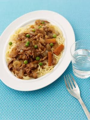 フライパンに1.5リットルの湯を沸かし、塩大さじ1を加え、グリーンピースを1分ゆで、網じゃくしですくって取り出す。続けて、スパゲティを入れ、袋の表示どおりにゆでる。ゆで上がったらざるに上げて水けをきり、器に盛る。【2】をかけ、グリーンピースを散らす。