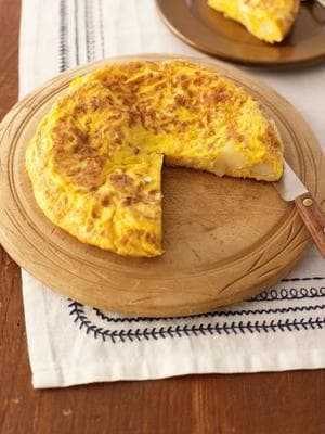 ほくほくとしたじゃがいも入りのスペイン風オムレツ。じゃがいもの水分が出ないよう、油に塩を入れるのがポイントです。