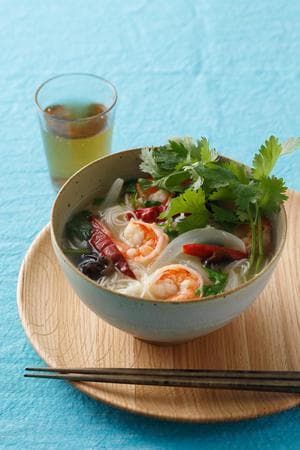 鍋にだし汁、赤唐辛子を入れて強火にかけ、煮立ったら、えび、きくらげ、玉ねぎを入れて強めの中火にし、アクを取りながら5分ほど煮る。Aを加えてひと煮し、火を止めてライムの絞り汁を加え、塩適宜で味をととのえる。