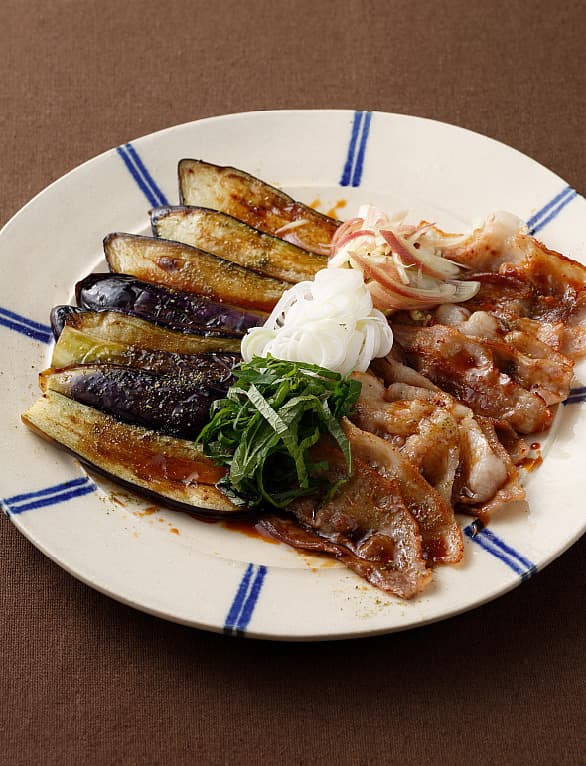 フライパンにサラダ油小さじ1を中火で熱し、豚肉を並べ入れる。両面をこんがりと焼いたら取り出し、器の片側に盛る。なすをペーパータオルで水けを拭いてから、フライパンに並べ入れる。両面をこんがりと焼き、しんなりとしたら豚肉の器に盛る。