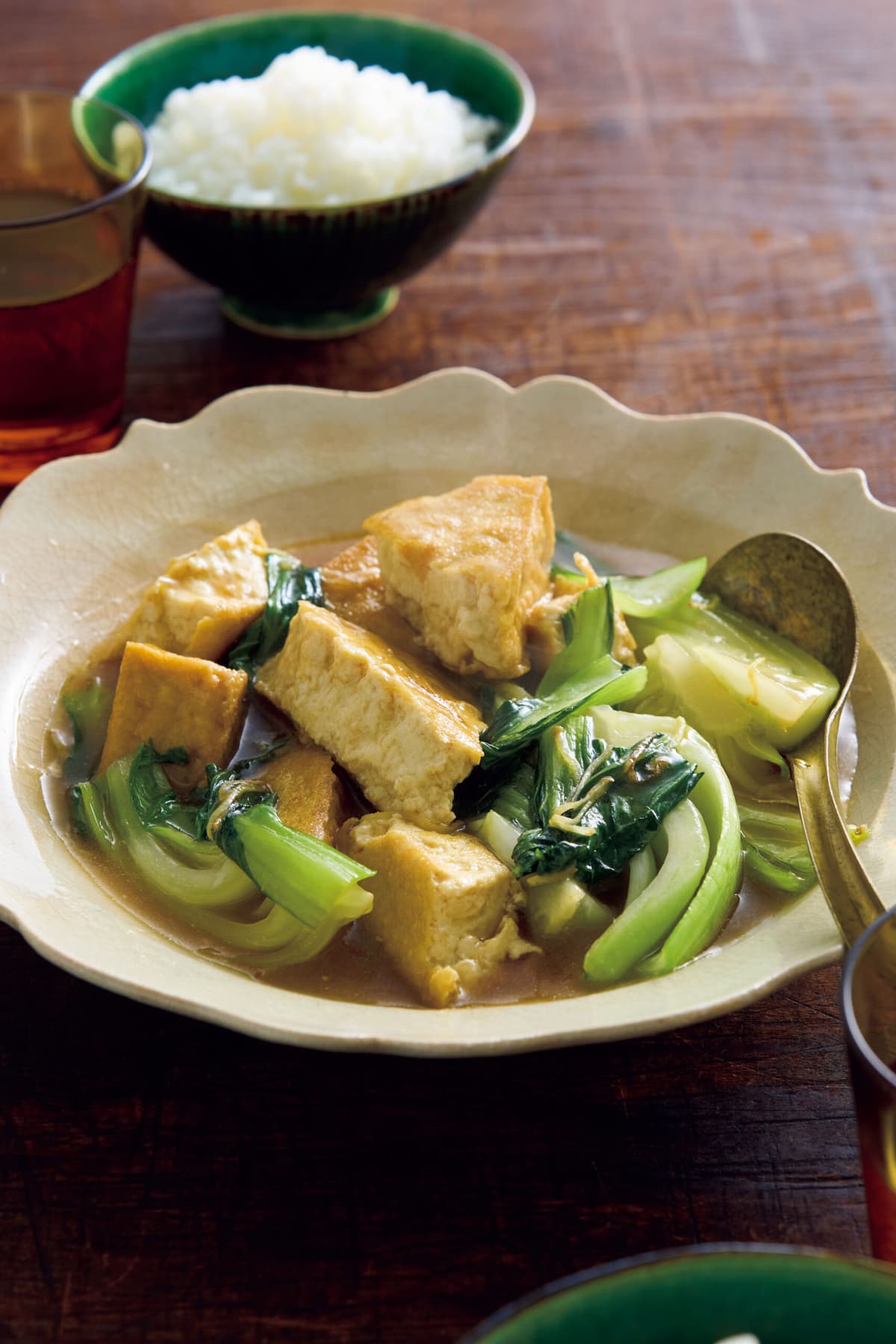 中華風のあんがからんだ厚揚げは、ご飯のおかずにぴったり。青梗菜の歯ざわりも楽しんで。