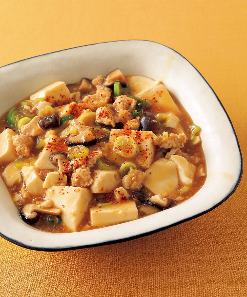 ひき肉の色が変わったら、煮汁を加えて煮立て、豆腐、ねぎを加えてさっと混ぜる。再び煮立ったらふたをし、弱めの中火にして、2分ほど煮る。水溶き片栗粉をもう一度混ぜてから回し入れ、手早く大きく混ぜてとろみをつける。器に盛り、好みで一味唐辛子適宜をふる。