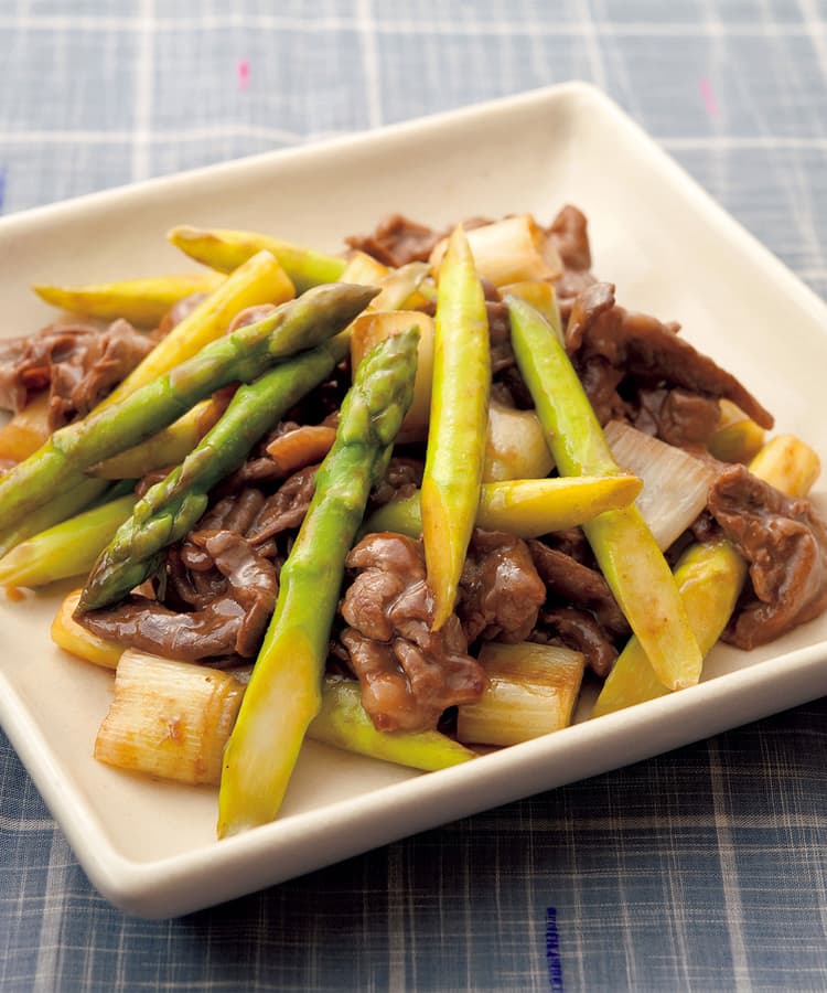 フライパンにサラダ油大さじ1を中火で熱し、ねぎ、しょうがを入れて炒める。香りが立ったら強火にし、アスパラガスを加え、水大さじ1をふる。ふたをし、ときどき鍋を揺すりながら1分ほど蒸し焼きにする。アスパラガスの色が鮮やかになったら牛肉を戻し入れ、合わせ調味料をもう一度混ぜてから加え、炒め合わせる。肉の色が完全に変わったら火を止め、ごま油少々をふって器に盛る。