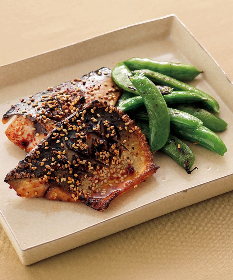 グリルを中火で熱する。さばを皮目を上にしてスナップえんどうとともに並べ入れ、4~5分焼く。スナップえんどうだけを取り出し、さばを裏返して、さらに3~4分焼く(両面焼きの場合は、皮目を上にして5~6分焼き、スナップえんどうを取り出して、裏返さずにさらに3分ほど焼く)。器にさばを盛り、スナップえんどうを添える。