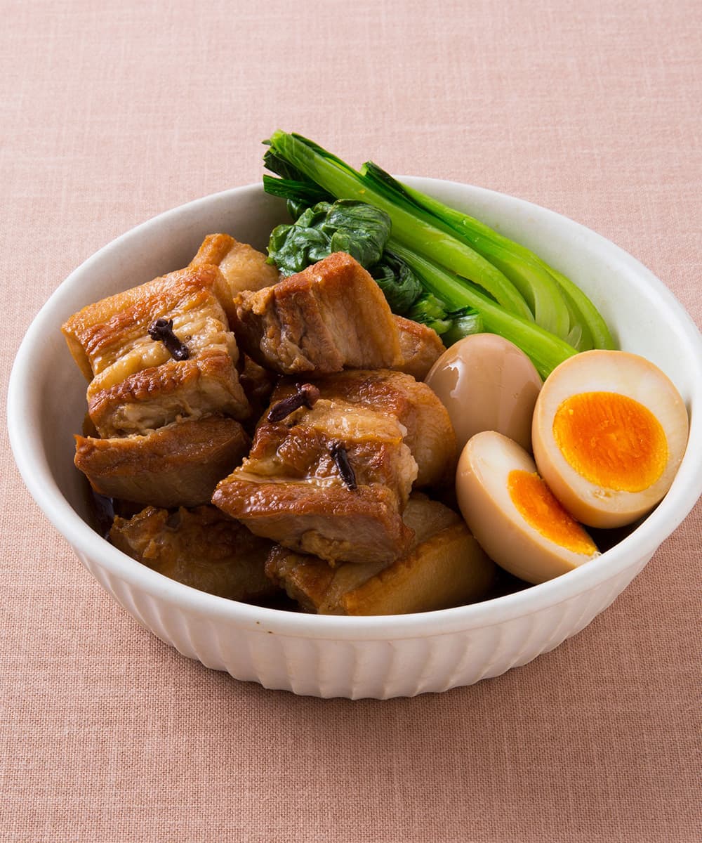 青梗菜は葉と茎に切り分け、茎は縦に4〜6割りにする。ゆで卵は殻をむく。【2】の鍋にゆで卵を入れて2分ほど煮て、青梗菜を加えて、しんなりするまで煮る。ゆで卵を好みで縦半分に切り、豚肉、青梗菜とともに器に盛る。