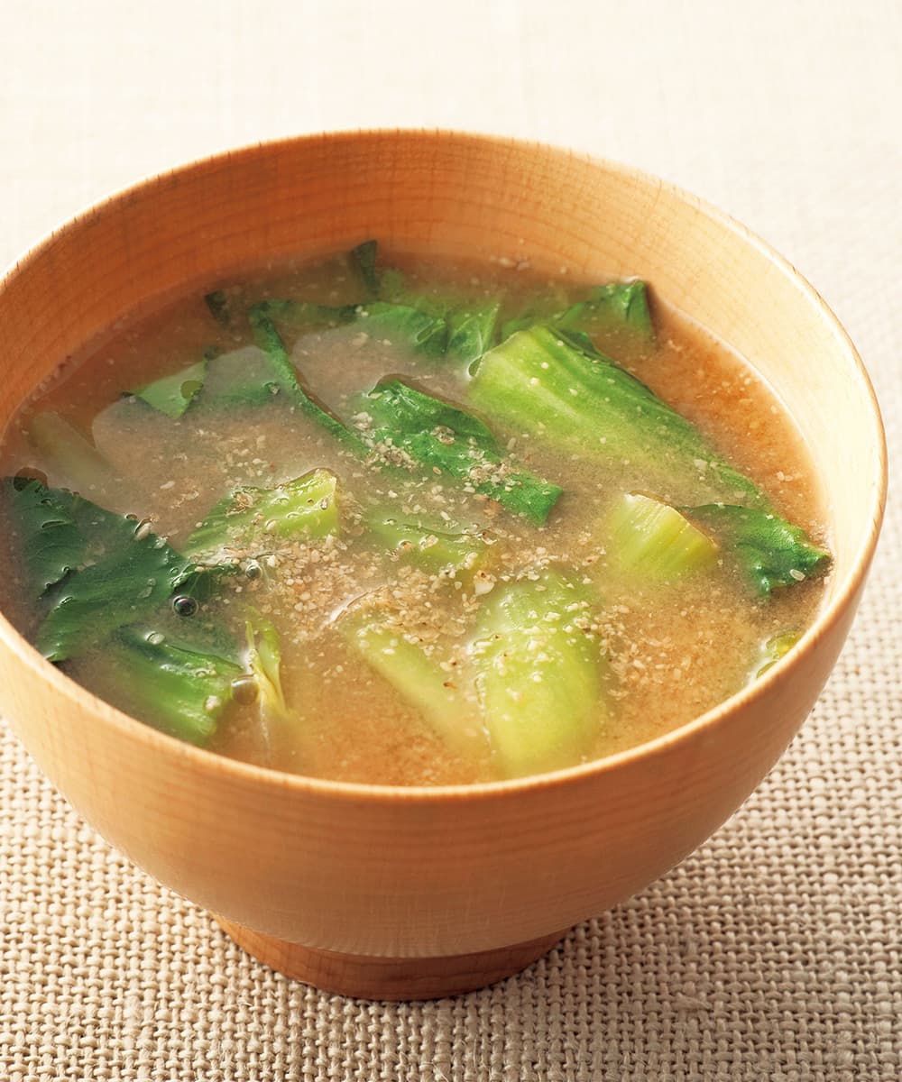 鍋にだし汁と青梗菜の茎を入れて中火にかけ、煮立ったら葉を加える。再び煮立ったら、みそ大さじ1と1/2~2を溶き入れ、白すりごまを加える。ひと煮したら火を止め、器に盛る。