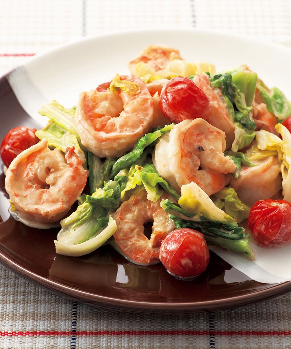 えびは殻をむいて、尾を取り除き、背中に切り込みを入れて、あれば背わたを取る。ボールに入れて、酒大さじ1、塩少々を加え、手でかるくもみ込んで、5分ほどおく。流水でさっと洗ってざるに上げ、ペーパータオルで水けをしっかりと拭き取る。キャベツはしんの堅い部分をそぎ切り、3cm四方に切る。プチトマトはへたを取る。小さめの器に合わせ調味料の材料を混ぜ合わせる。