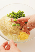 枝豆はさやつきのまま水に3~4分つけて解凍し、豆を取り出して、ペーパータオルで水けをよく拭く。ボールにひき肉と枝豆、たね用の材料を入れて、手で粘りが出るまでしっかりと練り混ぜる。10等分して厚さ1.5cmくらいの円形にまとめ、小麦粉を薄くまぶす。