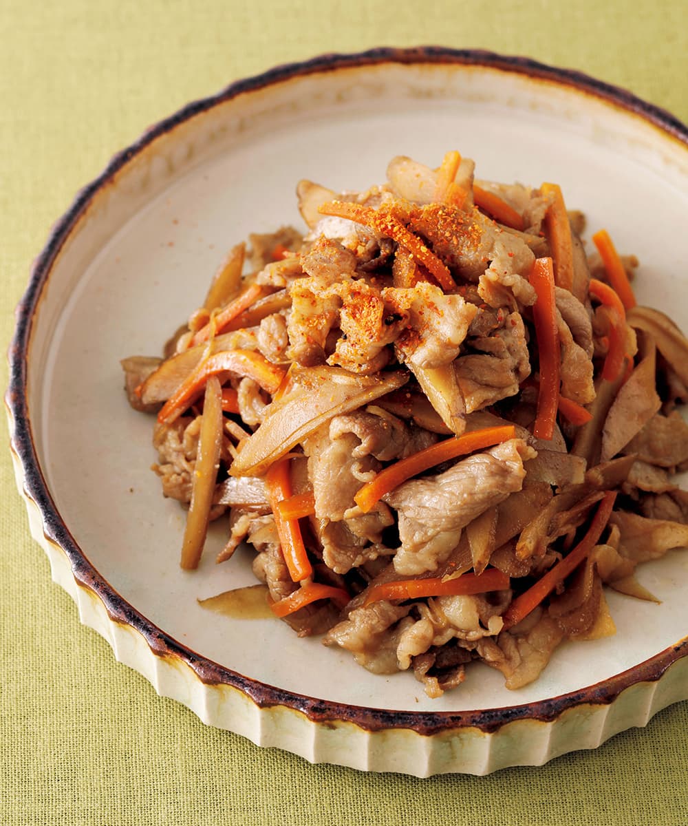 おなじみのきんぴらに豚肉をプラスして、ボリュームのあるおかずに。七味をふって、味にメリハリをつけます。