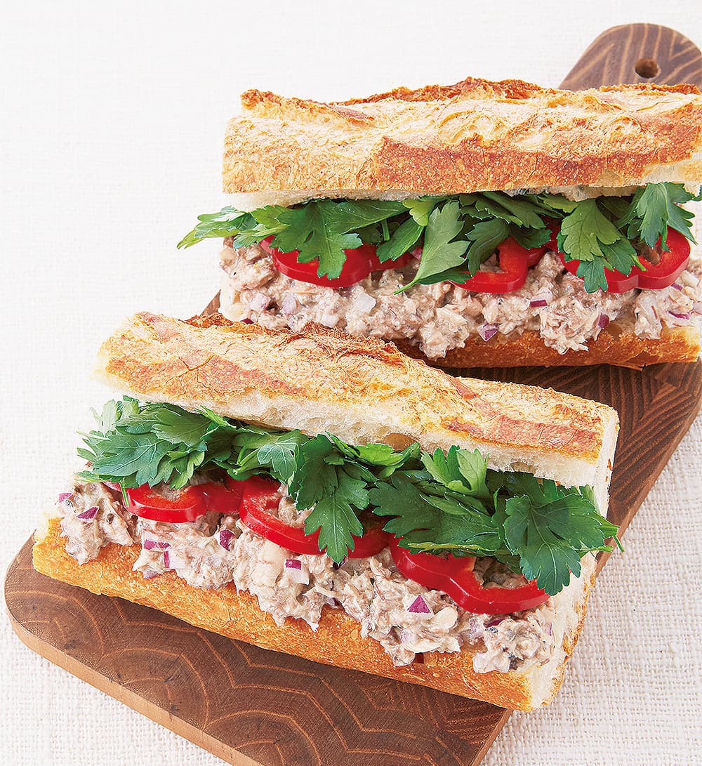 鯖缶を使ったこくのある〈さばマヨ〉と、さわやかな香りのイタリアンパセリを合わせて、具だくさんのサンドイッチに。パーティやピクニックにもぴったりの華やかさです。