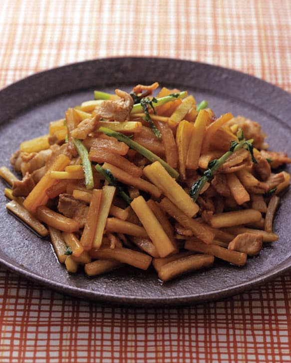 大根はよく洗い、皮つきのまま長さ3~4cmに切る。縦に幅5mmほどに切ってから、さらに縦に幅5mmの細切りにする。あれば大根の葉は長さ3~4cmに切る。茎の太い部分は、さらに縦半分に切る。しょうがは皮つきのまま細切りにする。豚肉は幅5mmほどに切り、酒、こしょう、しょうゆ各少々をふる。Aを混ぜ合わせる。