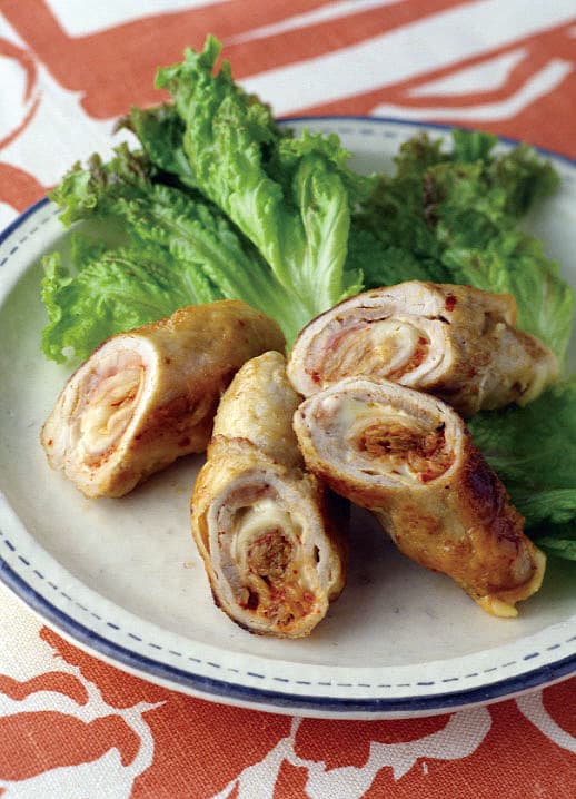 チーズは半分に切る。キムチは汁けをきる。まな板に豚肉1枚を縦に広げ、もう1枚を端が重なるようにして並べる。表面に塩、こしょう、小麦粉各少々をふる。手前の端にチーズ1切れとキムチの1/4量をのせ、向こう側までぎゅっと巻いていく。巻き終わりをしっかりと手で押さえて留め、全体に小麦粉を薄くまぶす。残りも同様にして、合計で4個を作る。