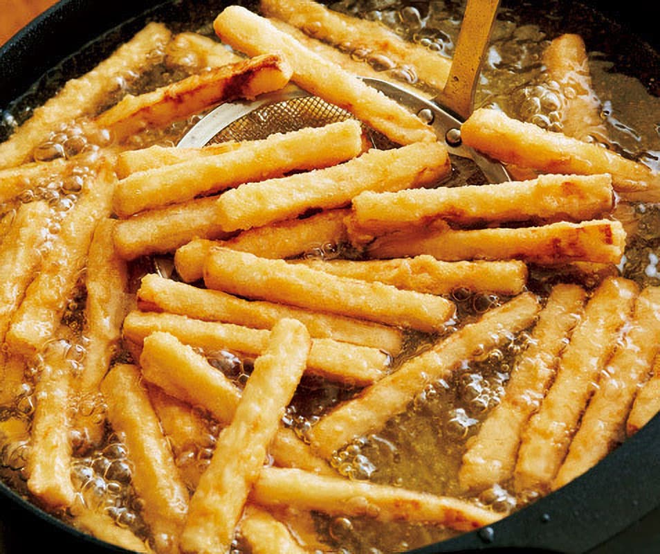 表面はサクッ、中はジュワッとみずみずしい、今までにないおいしさ。べちゃっとしないよう、ころもをつけたらすぐに揚げるのが鉄則です。