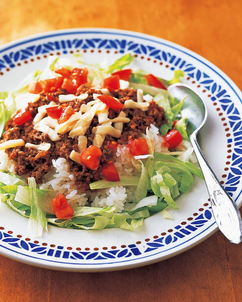 ミートソースのボールを取り出して、トマトをつぶしながらスプーンで混ぜる。器にレタスを敷いてご飯をのせ、ミートソースをかける。残りのトマトをのせてチーズを散らし、全体を混ぜながらいただく。
