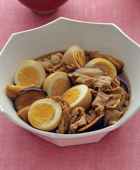 【1】の鍋にしょうゆ、酒各大さじ4、砂糖大さじ2を加えて中火にかけ、煮立ったら、豚肉、ゆで卵、ねぎ、しょうがを加える。再び煮立ったら弱火にし、ときどきアクを取り除きながら14~15分煮る。卵は取り出して横半分に切り、しいたけは軸を取って一個を3~4等分のそぎ切りにして、合わせて器に盛る。