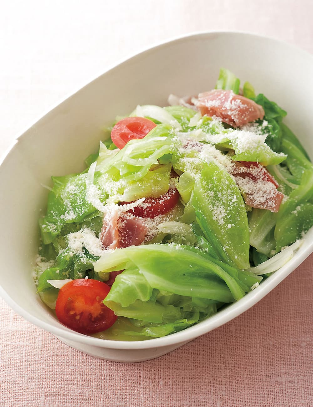 ボールにAを入れて泡立て器でよく混ぜ合わせる。キャベツと玉ねぎを加えて全体にからめ、生ハム、トマトを入れてひと混ぜする。器に盛り、粉チーズをふる。