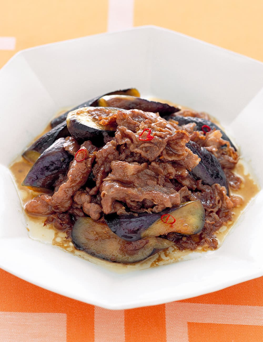 フライパンにサラダ油大さじ1/2を中火で熱して牛肉を炒め、色が変わったら、一度取り出す。同じフライパンにサラダ油大さじ1/2をたして中火で熱し、赤唐辛子をさっと炒める。なすを入れて炒め、少ししんなりとしたら、砂糖大さじ1と1/2をふって混ぜる。酒大さじ1と1/2、みりん大さじ1、しょうゆ大さじ1/2を順に加え、さっと炒める。牛肉を戻し入れ、みそ大さじ1~1と1/2を加えて混ぜる。水大さじ1を加え、全体をなじませるようにしながら炒め、強めの中火にして、フライパンを揺すりながら手早く炒める。