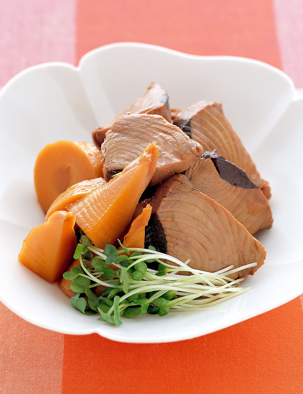 深めのフライパン(または鍋)にAを入れて中火で煮立て、かつおを入れてしょうがを散らし、強火にする。煮立ったら中火にし、アクを取ってたけのこを加え、落としぶたをして10分煮る。ふたを取り、鍋を揺すって味をなじませ、弱火にしてさらに8~10分煮含める。そのままさまして味をなじませ、器に盛り、貝割れ菜を添える。