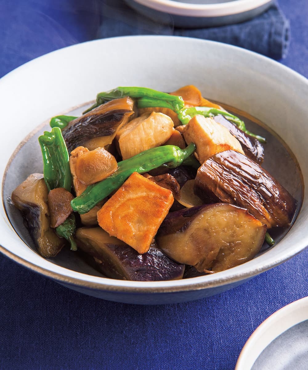 水2/3カップを加え、煮立ったら砂糖大さじ1を加え、再び煮立ったらふたをして弱火で6~8分煮る。しし唐辛子、しょうゆ大さじ2を加えて混ぜ、ふたをしてさらに7~8分煮て、器に盛る。